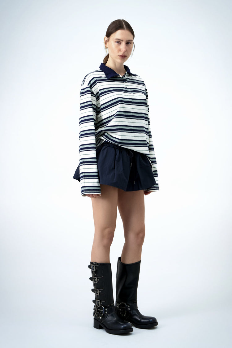 Lightweight nylon & cotton blend fabric, elastic high waist, drawstring front closure, electric blue inner shorts, mini length