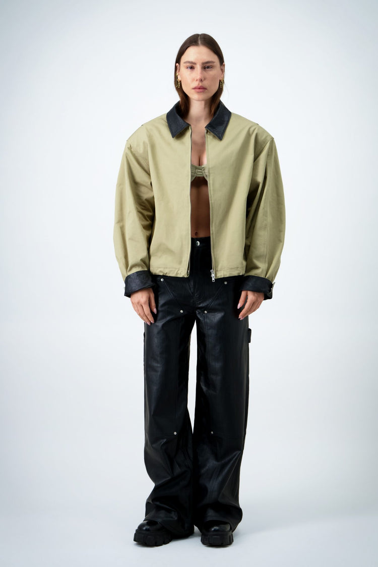 Midweight woven fabric, oversized fit, padded shoulders, pointed collar, contrast faux leather collar detail, invisible slant pockets, faux leather snap closure cuffs, front zip closure, lateral fit-adjusting buttons, elastic hem, lined