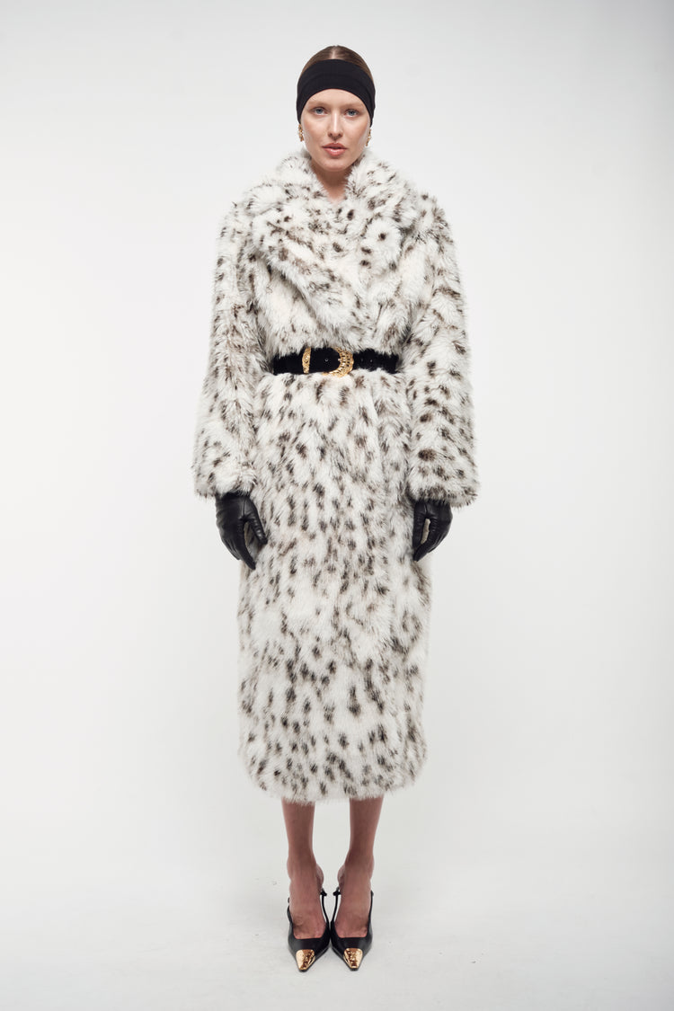 Heavyweight faux fur, oversized fit, snow leopard print, maxi length, exaggerated notch lapel, drop shoulders, front slip pockets, slip on style, lined