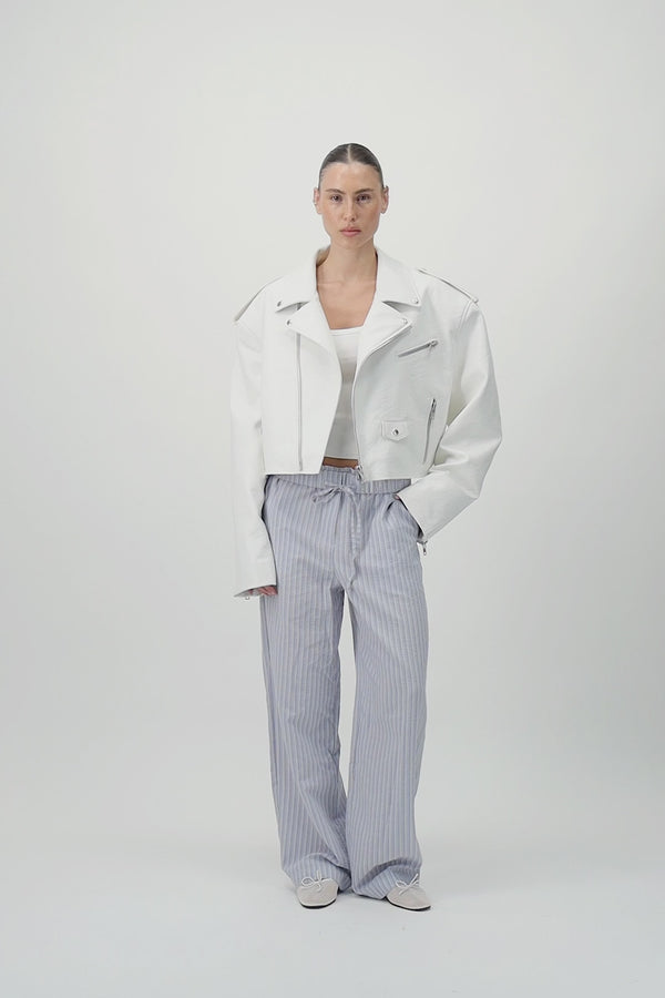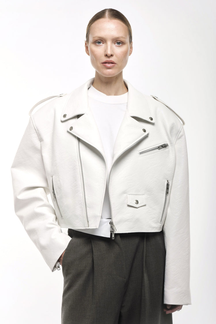 A reimagined biker jacket framed by strong shoulders and cropped, boxy silhouette. Made of buttery soft white vegan leather and finished with our signature hardware at zippers. Perfect for this summer!