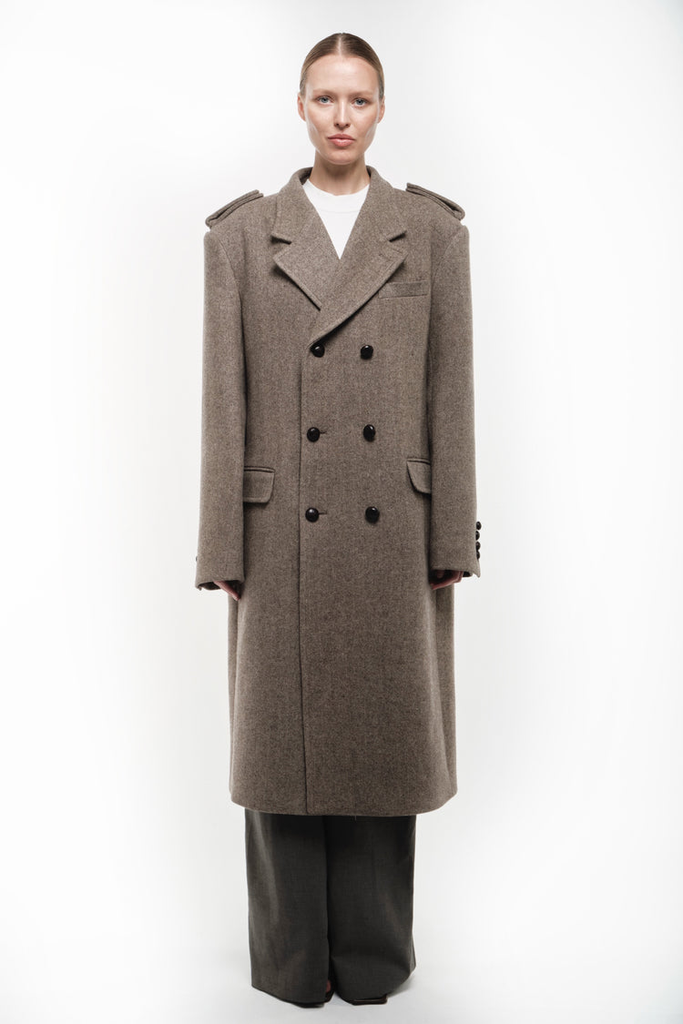 Oversized fit, heavyweight herringbone wool fabric, notch lapels, padded shoulders, front button closure, single welt breast pocket, front flap pockets, buttoned cuffs, double back vent, belted back detail, lined