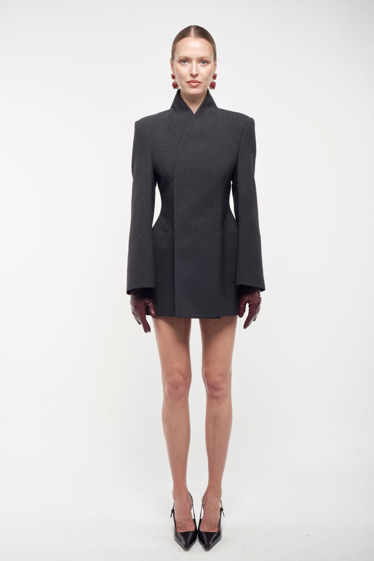 The blazer features an hourglass silhouette and falls below the hip. The high collar gives a mysterious air to this exquisite tailored piece, accentuated by the wrap style and maxi front pockets. Designed to accentuate the waist and can be worn as a dress or blazer.