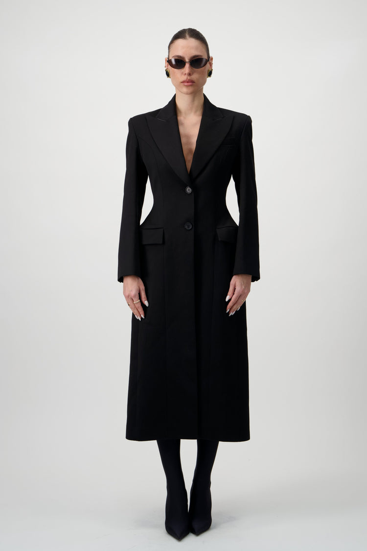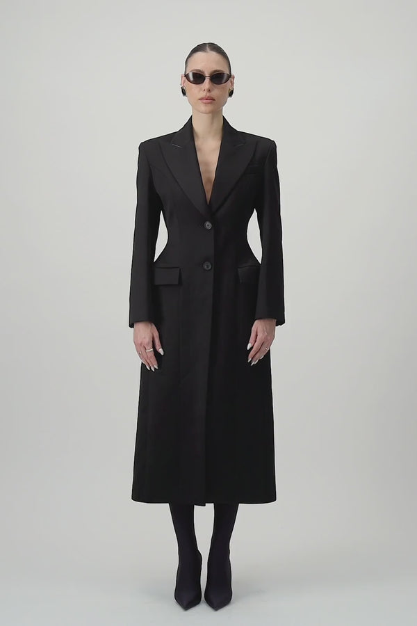 This is the ultimate wool-silk blend revenge coat, designed for a sleek, dramatic tailored silhouette distinguished by refined shapes. Featuring peak lapels, cinched waist, horn buttons and flap pockets, along with a back vent for a comfortable wear.
