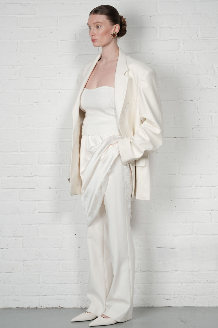 A strapless ribbed top designed with a clean, sculpted silhouette. Featuring a straight neckline and a close, body-contouring fit, it offers subtle structure with a soft, elasticated feel. Minimal, versatile, and effortless- designed to be worn alone or layered with intention.