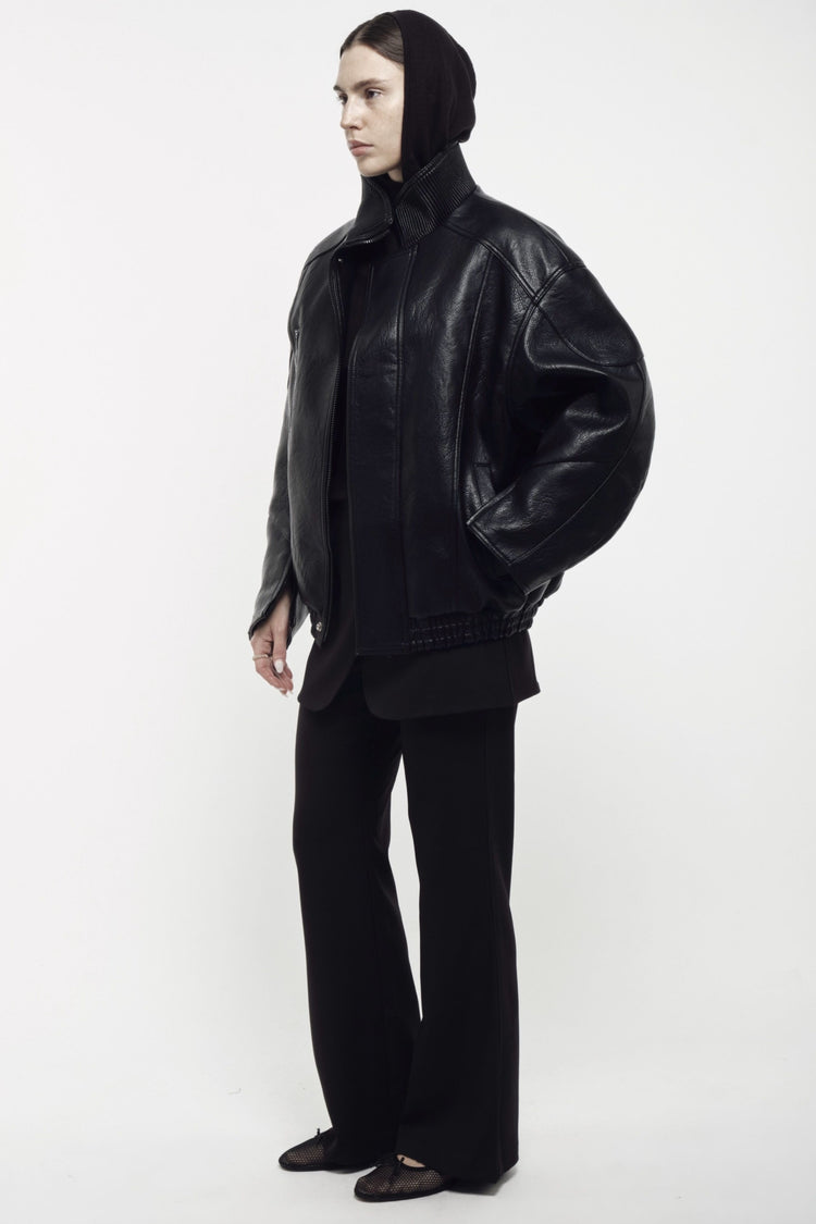 Midweight faux leather, relaxed fit, high collar, single zip pocket, wide balloon sleeves, zip cuffs, elasticated hem, hidden front zip closure, snap button placket, lined