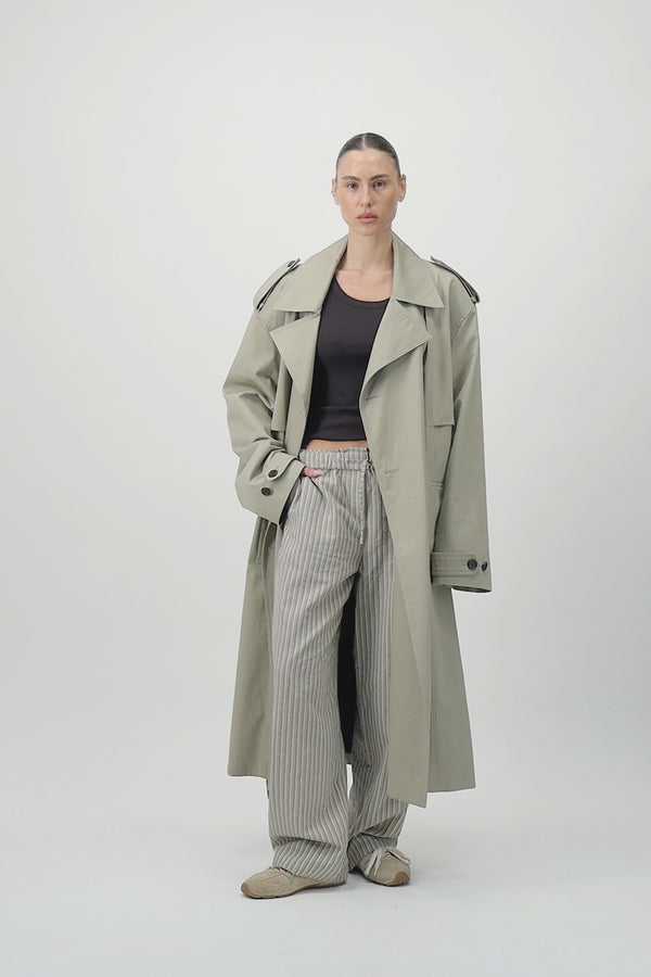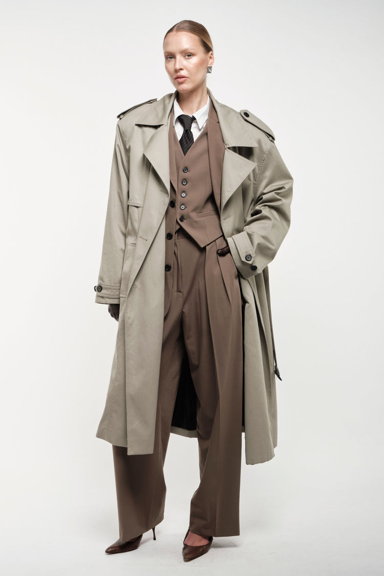 Crafted in woven cotton twill, this classic trench is cut with padded shoulders and a detachable buckle belt for shape. It features welted hip pockets, adjustable tab cuffs, and a double-breasted button closure. Fully lined, it combines timeless trench detailing with modern structure.