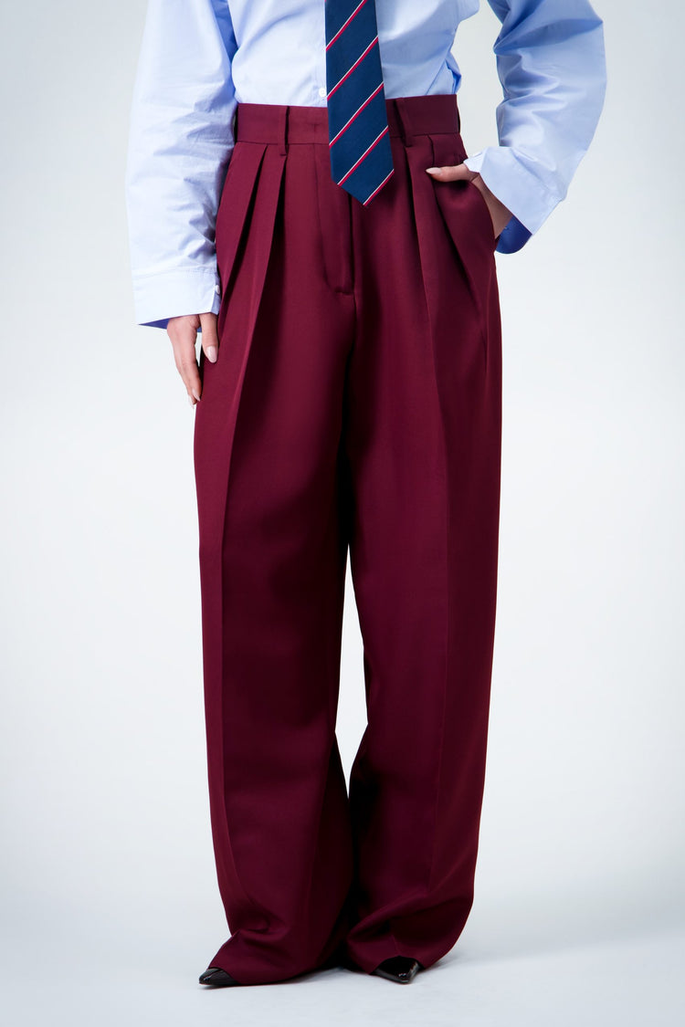 Soft woven suiting fabric with light stretch, baggy oversized silhouette, mid rise, front pleated design, lateral pockets, belt hoops, hook and bar closure, zip fly, unlined