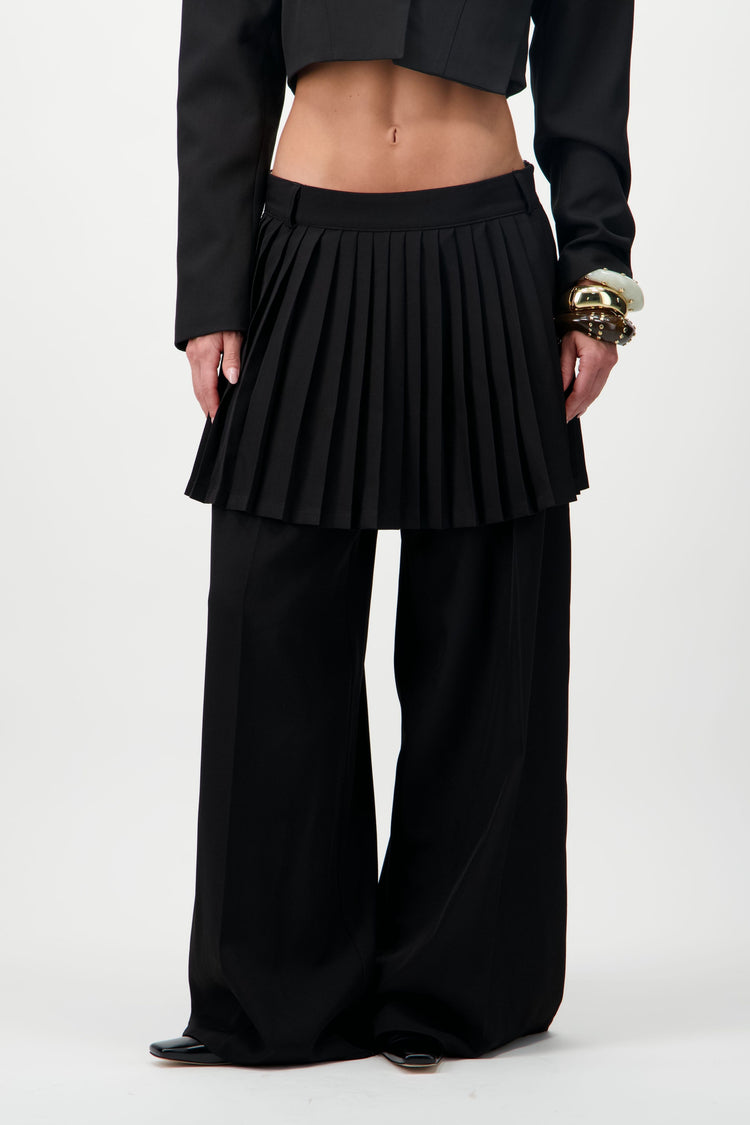 Soft suiting fabric with light stretch, slant pockets, pleated front skirt incorporated, baggy silhouette, belt loops, lateral zip & fly closure, illusion back pockets
