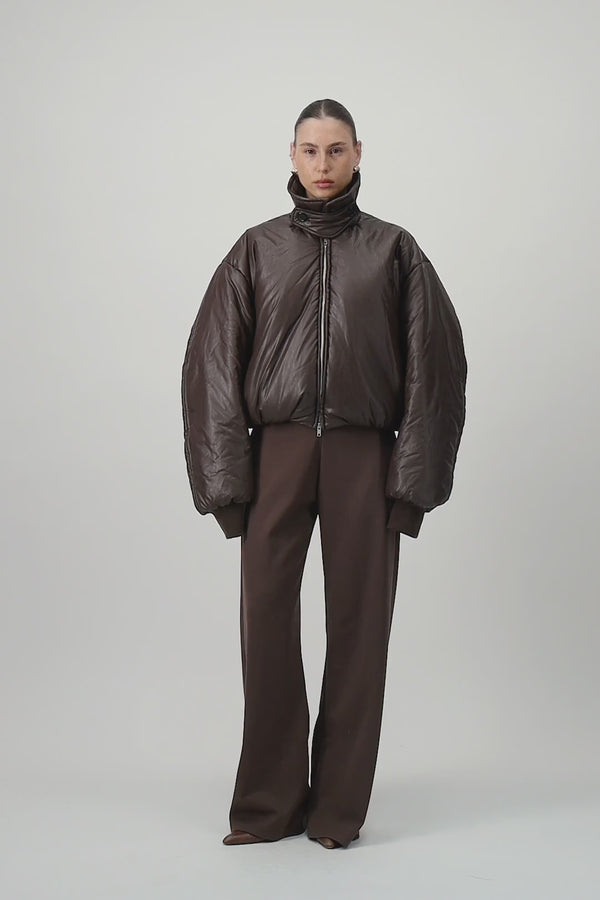 Add some volume to your outfits with this bomber puffer jacket. The faux leather model features an upturned collar, a gathered hem and double way zip closure.