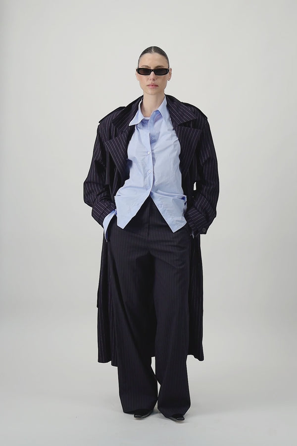 A tailored pinstripe pant with a clean, straight-leg silhouette. Designed to sit low on the waist, it features a flat front, subtle front pockets, and elongated lines that fall effortlessly to the floor. Crafted for fluid movement and sharp structure, it offers a refined balance between ease and precision.