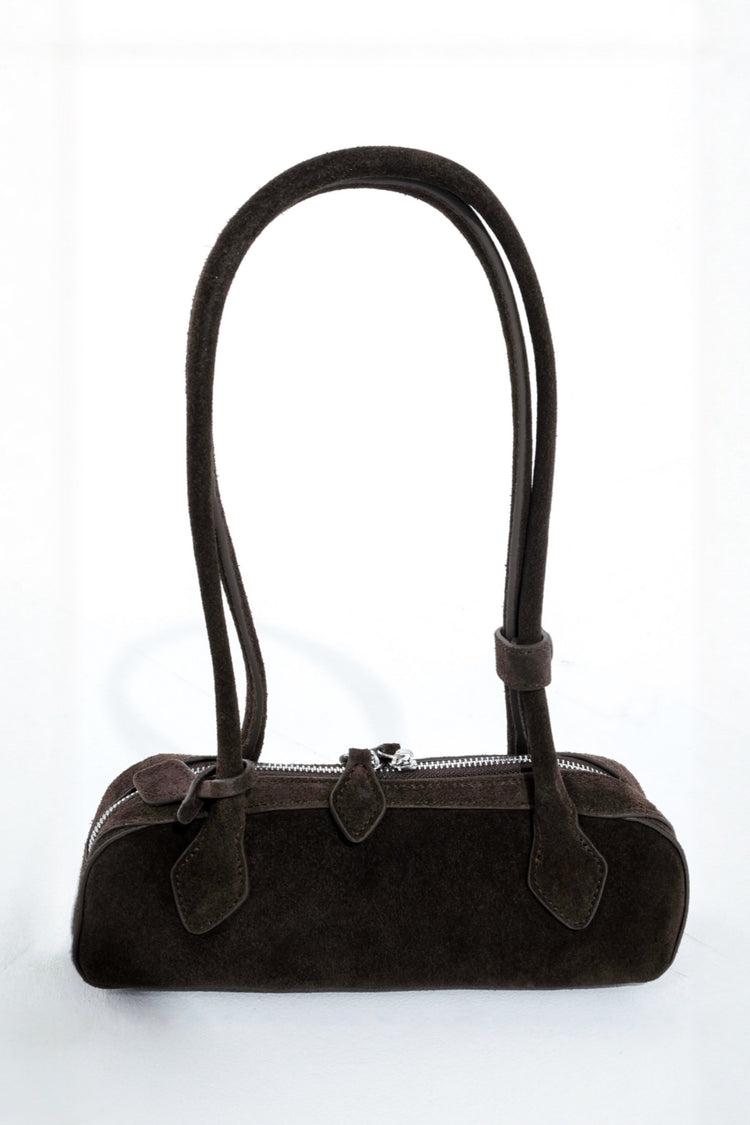 This bag is cut from smooth suede leather with extended shoulder straps that look exaggerated alongside the boxy, shrunken profile. Our newest bag features a structured shape and artful details.