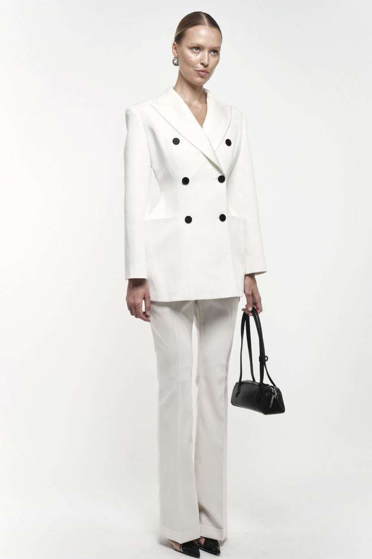 Tailored high-rise trousers cut from fluid fabric, designed with a clean front and pressed creases that extend into a flared hem. The elongated silhouette creates a leg-lengthening effect with sharp, minimalist lines.