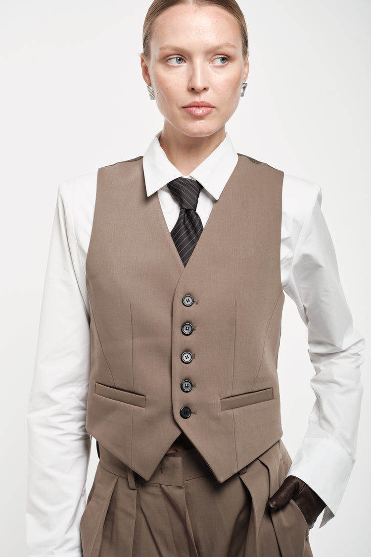 We draw on androgynous influences to create this waistcoat, tailored cut from twill with a lustrous satin back and adjuster to personalize the fit. Worn best with the rest of the suit for a powerful look.