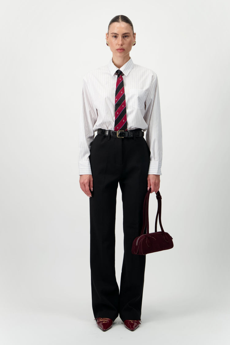 This is a longsleeve button-up shirt featuring a chest pocket, dropped shoulders and a relaxed fit. What makes it stand up is the waist adjustable string at the back that gives an interesting twist.