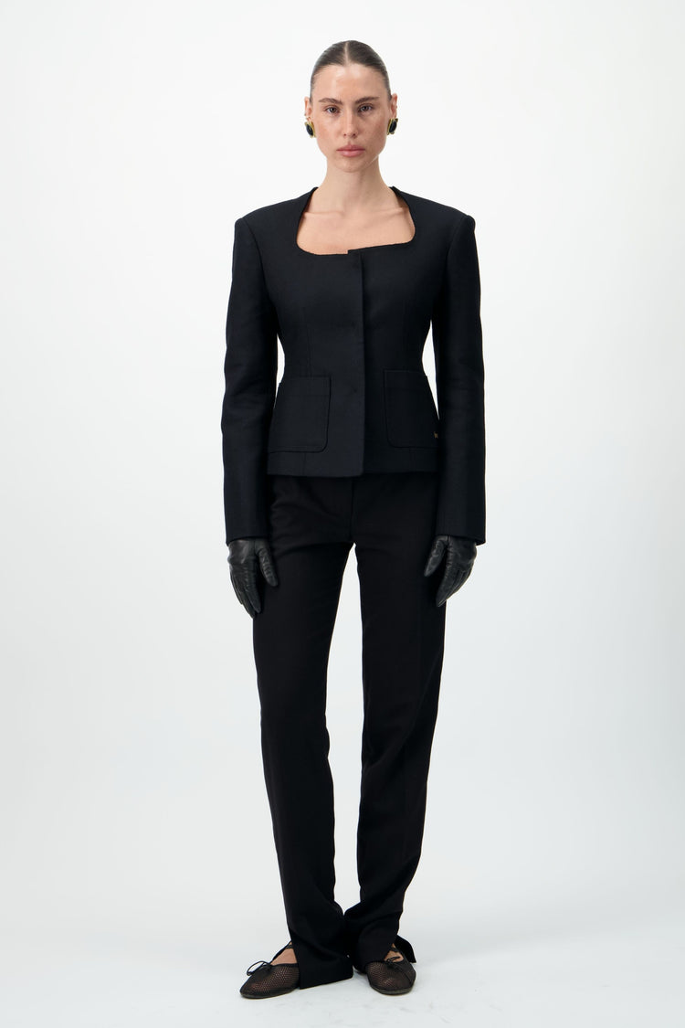 A refined, sculpted jacket with a clean square neckline, concealed front closure, and a tailored silhouette that contours the waist with precision. Finished with structured shoulders, elongated sleeves, and modern patch pockets. Minimal, architectural, and effortlessly polished.